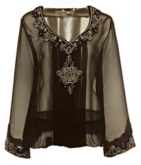 - Black Sheer Tunic Top with Bead Work around Neck