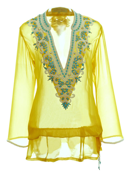 - Yellow Tunic with Turquoise Stones, Pearls & Crystals with Hip Drawstring (finished with a pearl beaded tassel)